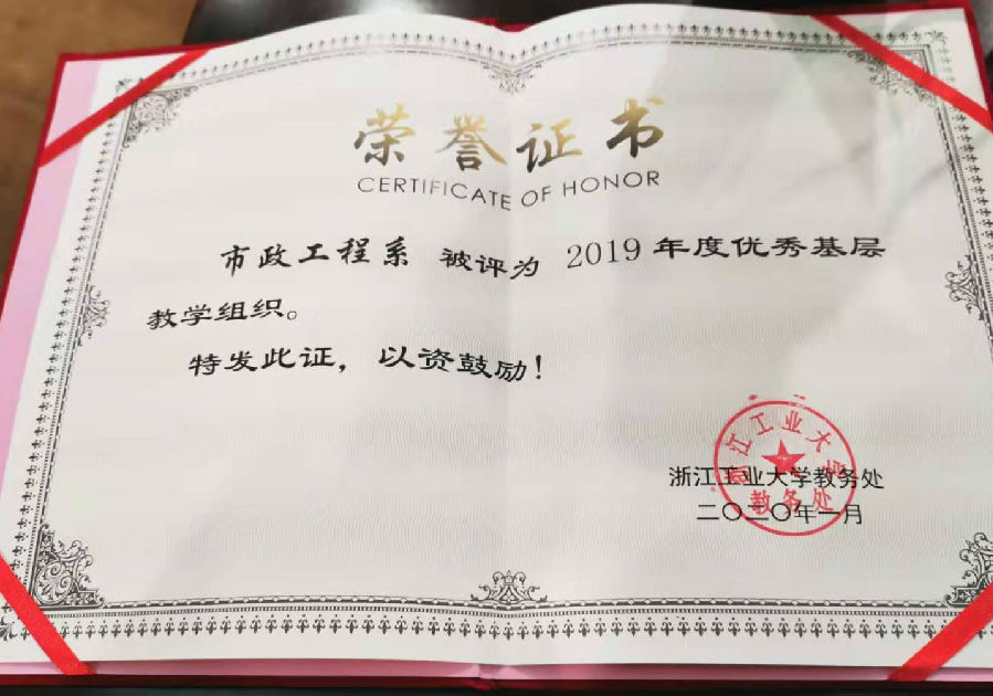 2020年1月16日,2019年度本科教学工作表彰大会在浙江工业大学朝晖校区圆廊会议室召开;市政工程系获得校级“优秀基层教学组织”称号,市政工程系副主任韩莹老师代表市政工程系领奖。继2017年之后,市政工程系再次获得校级“优秀基层教学组织”称号。