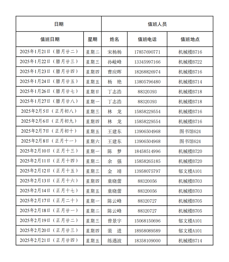 校园建设处2025年寒假值班表