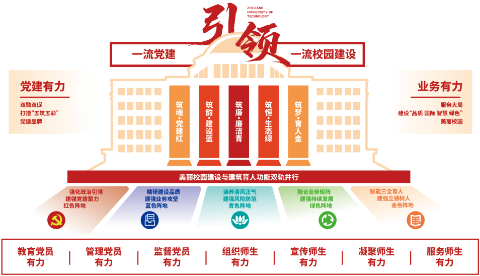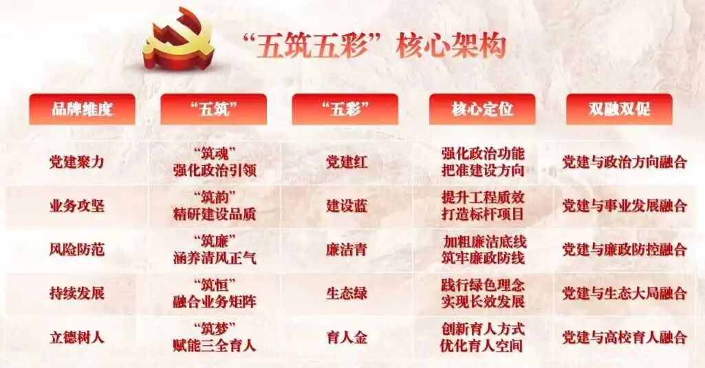校园建设处党支部正是以此为根本遵循,创新打造“五筑五彩”党建工作品牌,通过“筑魂·党建红”“筑韵·建设蓝”“筑廉·廉洁青”“筑恒·生态绿”“筑梦·育人金”,将政治引领、业务攻坚、风险防范、持续发展和立德树人五大阵地建设落到实处。